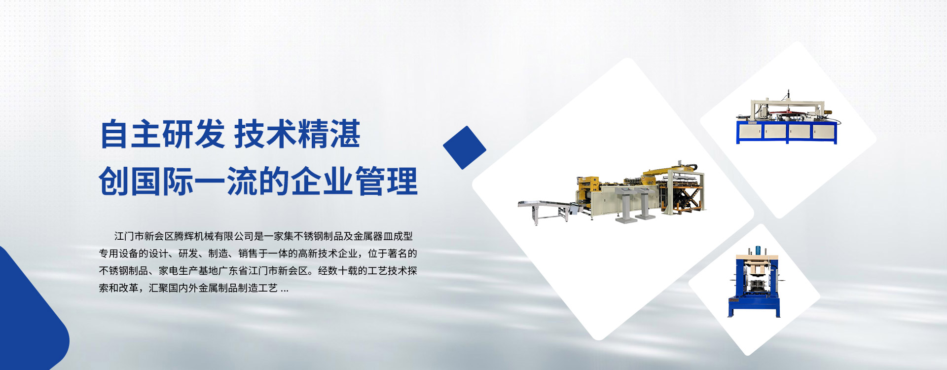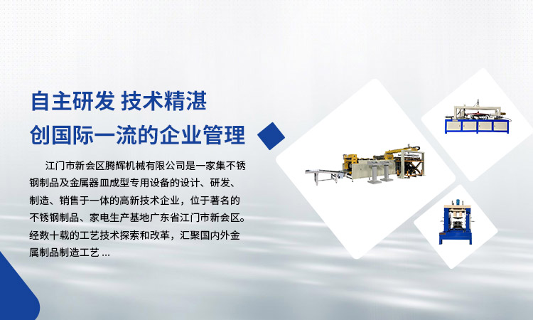 江門市新會區(qū)騰輝機(jī)械有限公司是一家集不銹鋼制品及金屬器皿成型專用設(shè)備的設(shè)計、研發(fā)、制造、銷售于一體的高新技術(shù)企業(yè),位于著名的不銹鋼制品、家電生產(chǎn)基地廣東省江門市新會區(qū)。經(jīng)數(shù)十載的工藝技術(shù)探索和改革,匯聚國內(nèi)外金屬制品制造工藝。